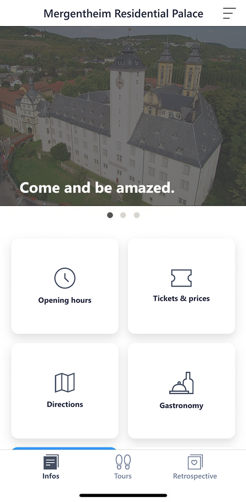 Nella sezione informazioni potete aggiornare gli utenti su tutto ciò che è importante sapere per la visita, come orari di apertura, indicazioni per come arrivare, guardaroba, servizi igienici e contatti, oltre al regolamento interno e all'offerta gastronomica. Inoltre, i visitatori possono prendere appunti personali riguardo alle informazioni rilevanti per la pianificazione della loro visita. Con una galleria di immagini, è possibile anche trasmettere un'idea di come è fatta la vostra mostra.