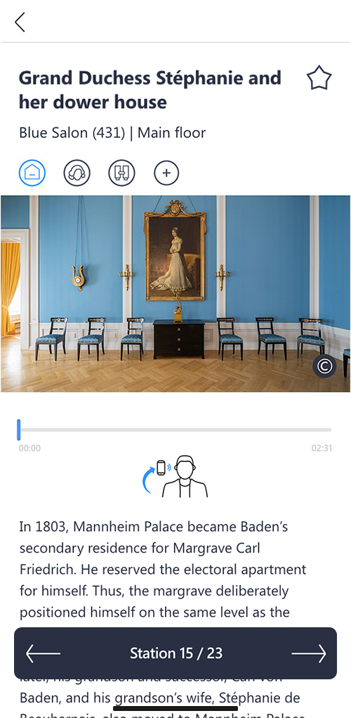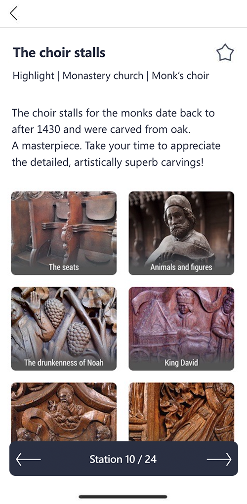 La stazione è la più piccola unità organizzativa. Le singole stazioni possono essere combinate per creare dei tour. Come una stazione venga utilizzata esattamente, ad esempio se si concentra su un solo esponato, una vetrina, un'intera stanza o un luogo, dipende da voi. All'interno di una stazione, è possibile utilizzare testi, audio, video, immagini (con vista ingrandita dei dettagli), gallerie di immagini e molto altro.