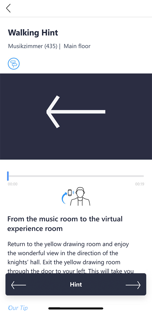 La funzionalità “Navigazione” fornisce ai vostri visitatori indicazioni su come raggiungere la stazione successiva durante il tour. Proprio come farebbe una brava guida di un museo, potete segnalare particolarità lungo il percorso. Tra l’altro, la “Navigazione” è molto adatta per spiegare la viabilità dei tour in caso di presenza di ostacoli per passeggini o sedie a rotelle. Inoltre, sono disponibili vari simboli di percorso, testi e, se lo desiderate, anche file audio. La “Navigazione” funziona con tutte le modalità di orientamento descritte di seguito.