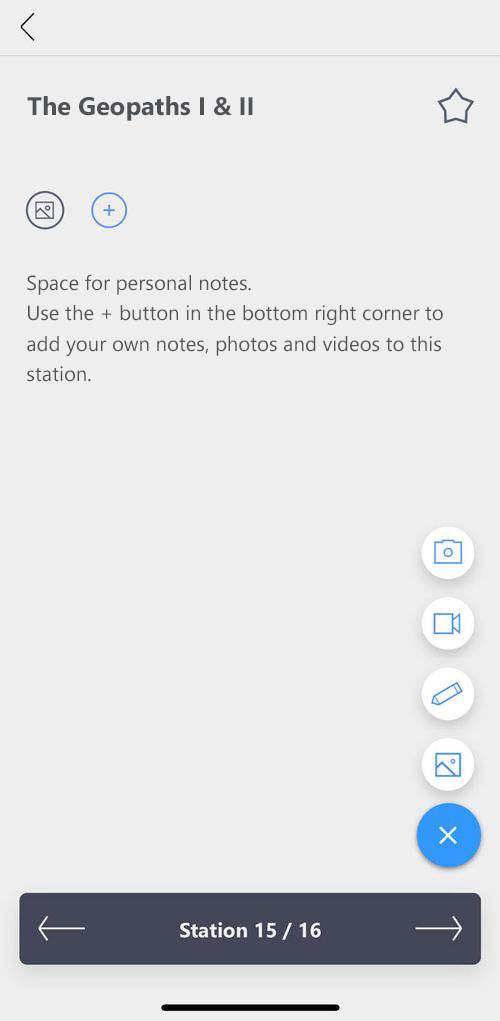 Gli utenti hanno la possibilità di prendere appunti per ogni stazione sotto forma di foto, video o testi. Inoltre, è possibile aggiungere le stazioni ai preferiti. monamu crea un riepilogo basato su queste informazioni per gli utenti (maggiore dettaglio più avanti). I dati sono conservati in conformità al GDPR sullo smartphone degli utenti. Inoltre, è previsto che in futuro i contenuti generati dagli utenti possano essere condivisi con amici, conoscenti e/o altri visitatori della mostra.