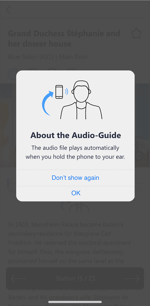 monamu funziona al meglio con le cuffie, ma cosa succede se un visitatore non ne ha a portata di mano? In questo caso, la funzionalità "Phone-to-ear" impedisce che i dati audio vengano riprodotti attraverso l'altoparlante dello smartphone. Gli utenti devono tenere lo smartphone all'orecchio, come durante una telefonata, per ascoltare e avviare automaticamente la guida audio. In questo modo, tutti i visitatori possono godersi la mostra senza essere disturbati.